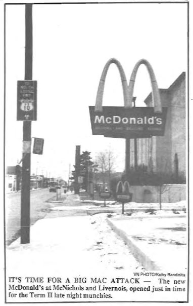 OK- well not exactly ON campus, but you can't miss it. McDonald's set up shop at the corner of McNichols and Livernois in 1989. Originally on that corner was Gregg's Pizza, which just moved to another building nearby on Livernois. When it opened in January 1989, it became the 35th McDonald's franchise to open in the city of Detroit.