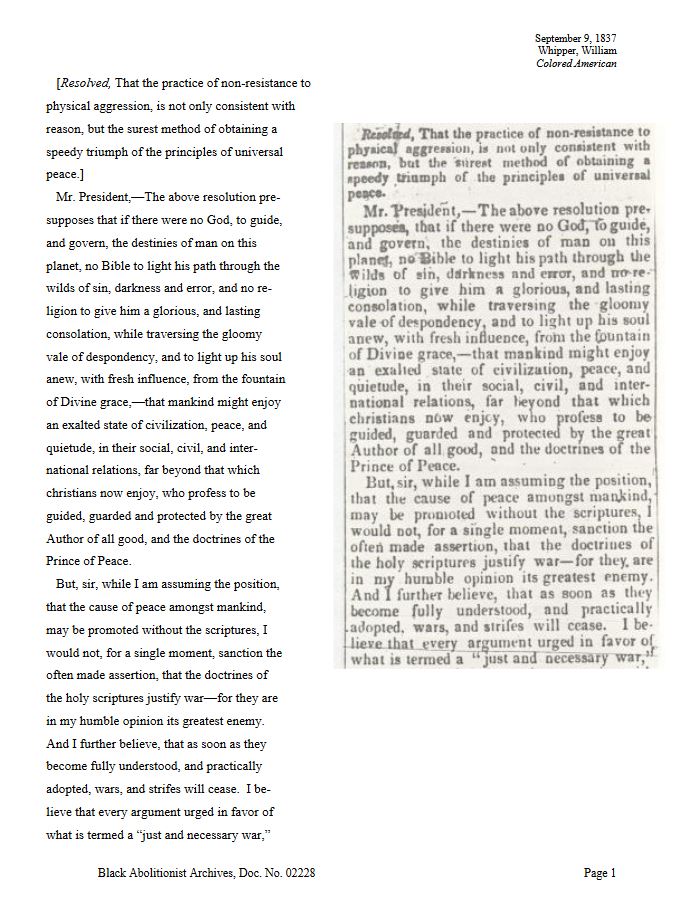 “Resolved, That the practice of non-resistance to physical aggression, is not only consistent with reason, but the surest method of obtaining a speedy triumph of the principles of universal peace.” — William Whipper, 1837