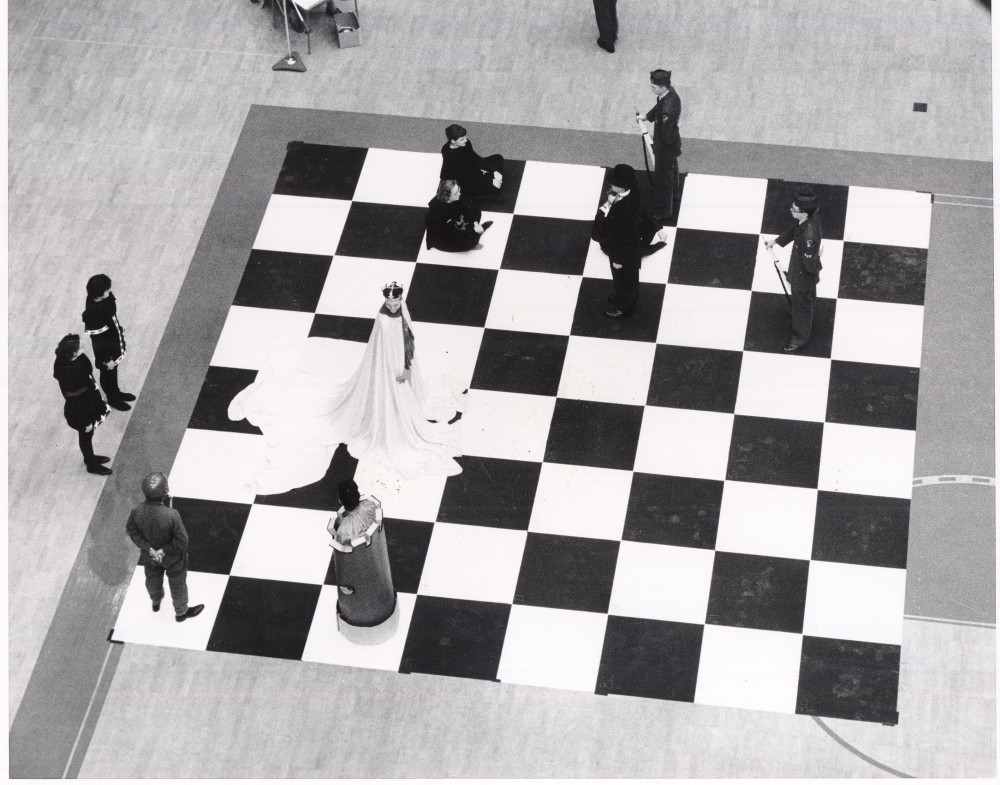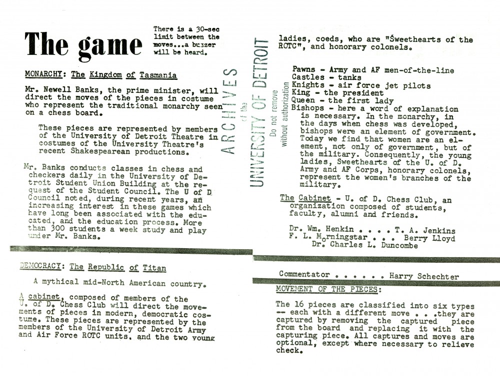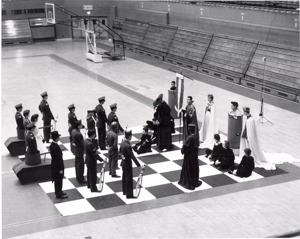 Monarchy met Democracy in a full scale "Human Chess Game" at the University of Detroit in 1959. Moving on a 576 square-foot chess board were members of the University of Detroit Theatre in full costume of a royal court to represent the Monarchy and members of the University of Detroit Army and Air Force ROTC in their military uniforms, complete with tanks for castles, pilots for knights, and a president and first lady for king and queen to represent Democracy.