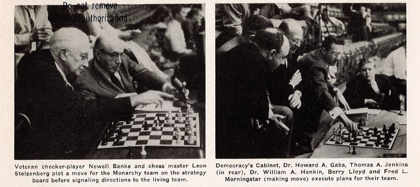 Democracy realized that they had a lost game by the 59th move, but the game was played to a checkmate to demonstrate a complete game to those in the audience who had never witnessed a chess game.