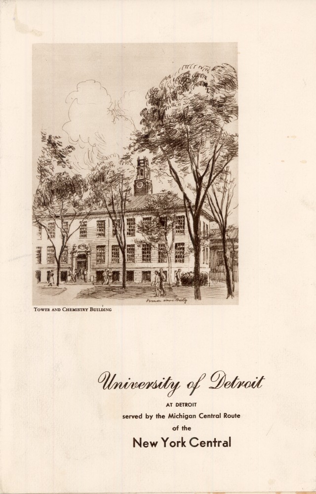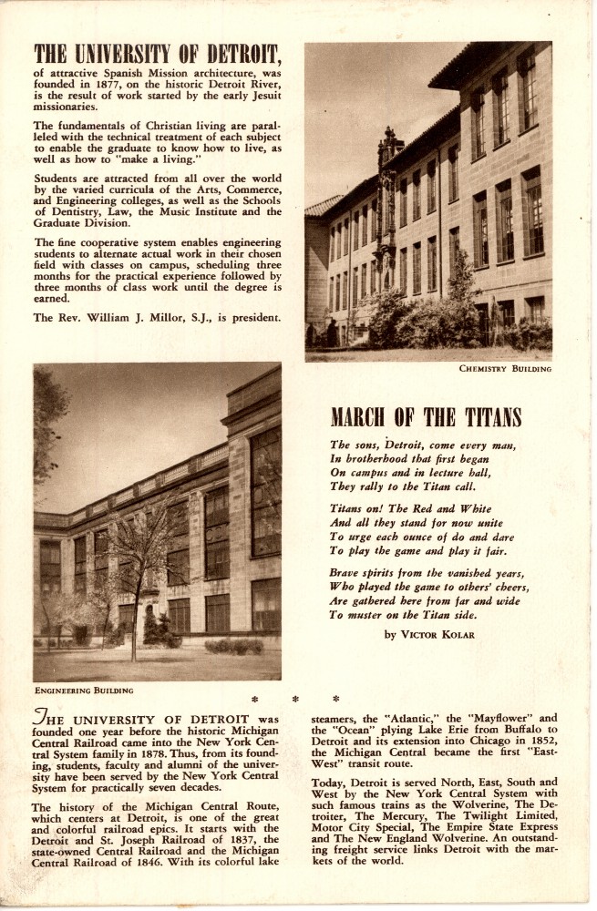 With the recent announcement of Ford Motor Company acquiring the historic Michigan Central Train station, in browsing the files in archives, I happen to come across a menu featuring the University of Detroit for a train route between Detroit and New York in 1949.