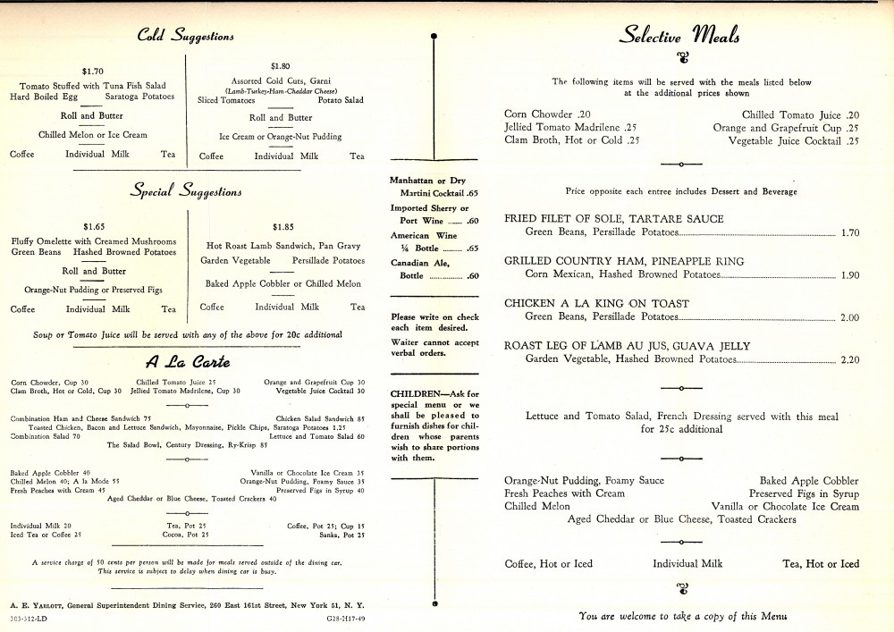 The artist sketch by Norman Howe Bailey is on the front of the menu. Check out the 1949 prices on the dining car menu.