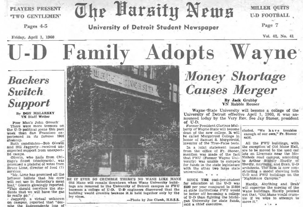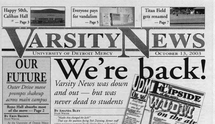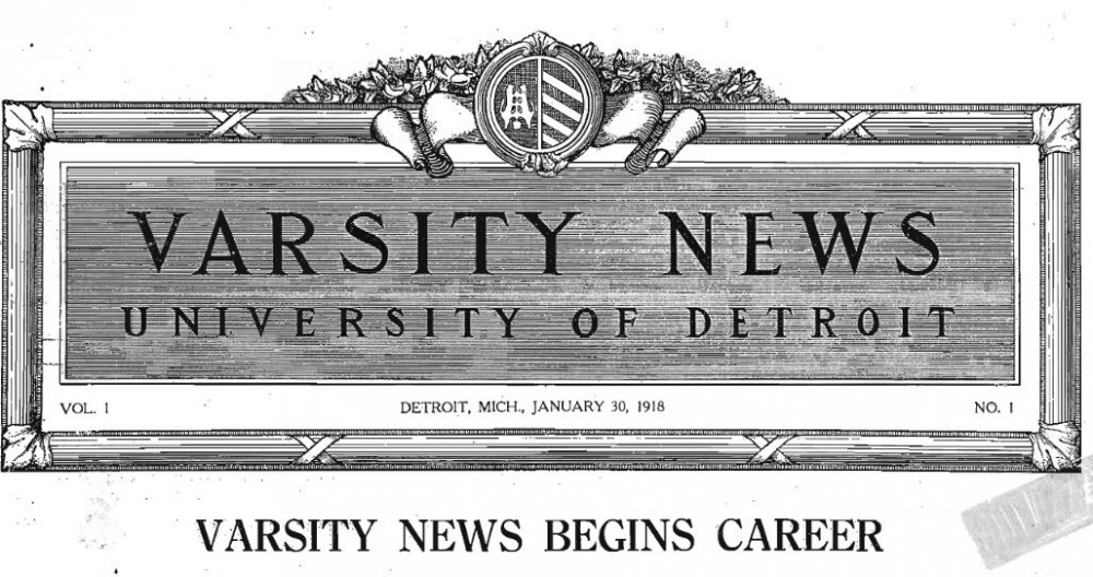 Varsity News, the student newspaper is published by the University of Detroit Mercy. It has been running almost continuously for 100 years. There have been a couple of gaps, one for the 1922-23 academic year (I have not found any explanation for the gap), and it almost died in the fall of 2003. It seems that it was coming out of the department for Student Life as an activity, instead of as a part of a journalism course. There was also an issue of finding a journalism advisor to oversee the operation.