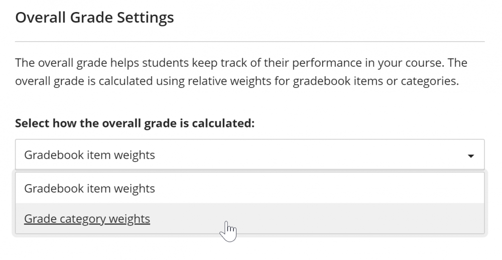 Overall Grade replaces the Weighted Total column from Blackboard Classic's Grade Center, allowing you to set up weighted grading based on Categories or Items. The first choice to make is under Overall Grade Settings on the right. Do you want to calculate the Overall Grade using individual ITEMS or using CATEGORIES?