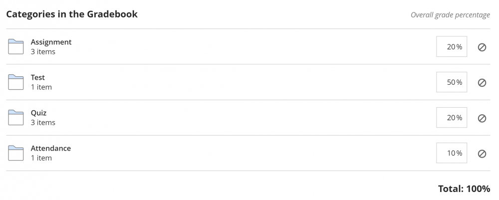 Unlike in Blackboard Classic, you cannot save the page if your percentages add up to more or less than 100%. This means you must create all the Items or Categories you need before setting up the Overall Grade. Once you’ve chosen your method and created any necessary categories, you can enter the percentage values on the left.
