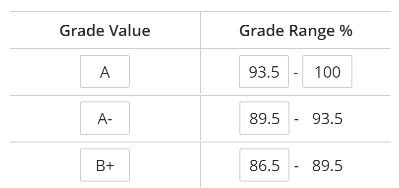 An important note about Schemas: Just like in Classic, Schemas are applied WITHOUT ROUNDING. This means that if you set B+ to be 87-90 and A to be 90-94, an 89.9 will still display B+. You can either explain this to students or modify the Schema to be 0.5 lower, as shown below (first few rows only). This will provide correct rounding.