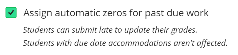 By default, Blackboard Ultra courses are set to automatically assign zeroes for past due work. This replaces the “Running Total” option in the Weighted Total column of Blackboard Classic. Rather than treating -- as zero, like Running Total did, Automatic Zeroes visibly changes the score for missing work to a zero when the due date passes. If you change the due date or add an Accommodation for a student, these zero scores will update automatically. To disable this feature, uncheck the box. Unchecked, missing assignments will not contribute positively or negatively to the Overall Grade.