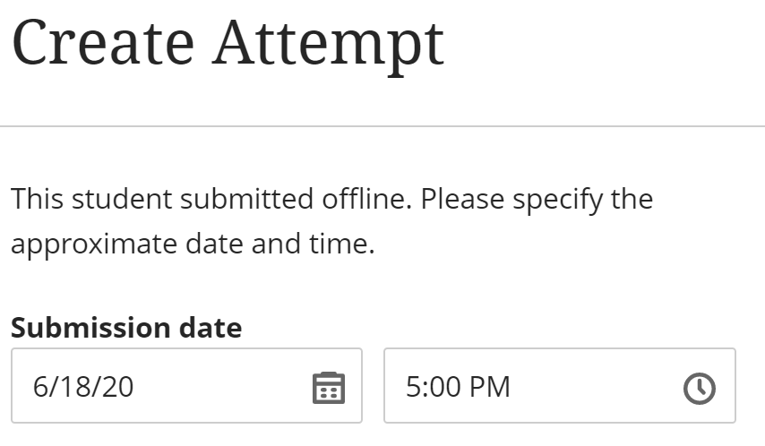 Note: If the Assessment was created with the “Collect submissions offline” option enabled, you will need to access it using option 1, the Gradebook List view. When you click a student’s row you will see a Create Attempt with a submission date. Set the date and click Save to create the offline attempt and start grading. You will not see the document window described below, but you will have access to the feedback and grading tools at the top of the page.