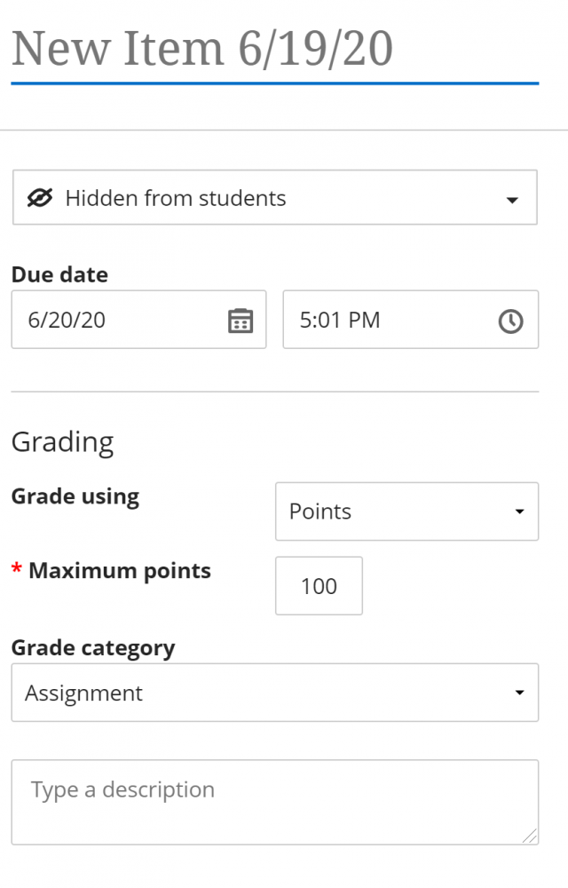 You may wonder what the difference is between the Item option and an Assessment with the “Collect submissions offline” option enable. They behave very similarly, but there are two advantages of using an Assessment instead of an Item: