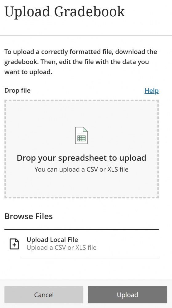 The second button uploads data to the Gradebook. You can upload and replace existing values, or add new ones. It’s important to have a correctly formatted file, so you should first Download the Gradebook and then upload the modified file, rather than trying to create a new file. Make sure you don’t rename any of the existing columns or the file may not upload correctly. It’s ok to add new columns, they will be added to the Gradebook as Items.