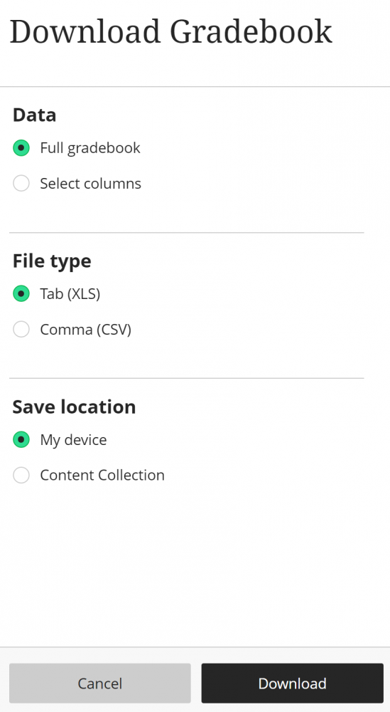 When you click the Download button you will see a series of options. You can choose to download the Full Gradebook or Select Columns (check the ones you want to download). You can also choose the file type (XLS is Excel, CSV is universal comma-delimited), and a location (My Device will prompt you to download the file, Content Collection stores the spreadsheet file in your Blackboard course as backup.)