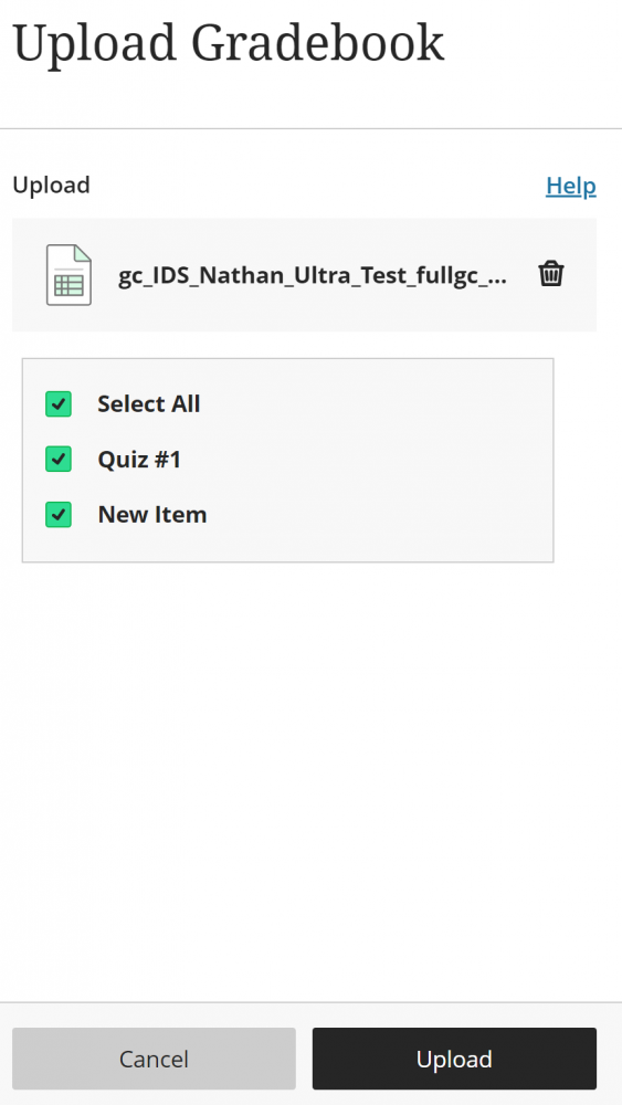 Click UPLOAD to insert/update the selected items in the Gradebook.