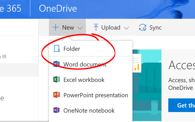 First, log into your Detroit Mercy Office 365 account by going to http://portal.office.com and navigate to OneDrive. Now you'll need to add a folder. Click NEW at the top of the screen, then select FOLDER.