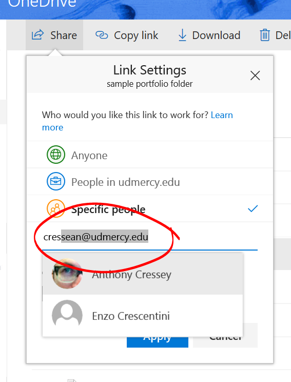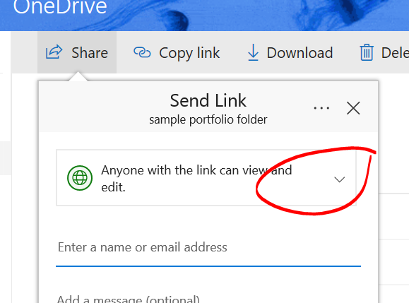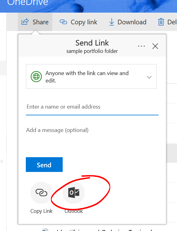If your portfolio requires open access, or if you are comfortable with anyone who has a link to the folder being able to access its contents, click OUTLOOK button. This will open the link to your folder in an Outlook email window. Enter the email addresses of the profile evaluation board's members, any appropriate subject, any additional message content, and send your email.