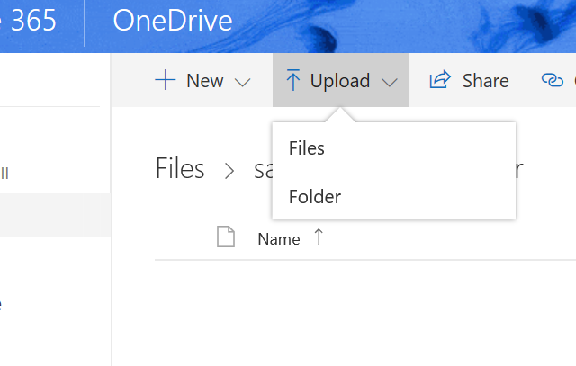 Now you can add files to the folder either by selecting items on your computer and dragging them over the open OneDrive folder in your browser, or by clicking UPLOAD, then choosing FILES or FOLDER.