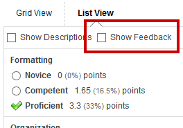 If you prefer to score in list view, the process is similar — select the appropriate level of achievement for each criteria. If you’d like to provide feedback on each criteria, click the SHOW FEEDBACK check box at the top of the list.