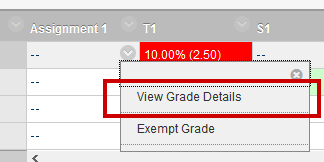 Once you’ve set up a rubric and associated it with a column in your Grade Center, using it to grade that column is pretty easy. Load up your Grade Center and point to the cell you want to grade. Click the options button (arrow in a gray circle that appears when you point to a cell) and choose VIEW GRADE DETAILS.