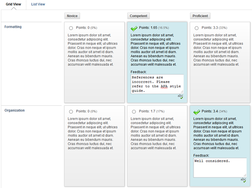 Grid view is the default for grading with a rubric. For single-score style rubrics, just click the level of achievement for each criteria. When a level of achievement box is selected, you will be given the option to provide the student with feedback on that particular aspect of their score.