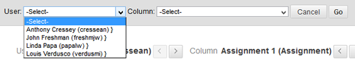 Then you can select any student in the class from the USER list (and and any column from the COLUMN list), then click GO to jump to the GRADE DETAILS for that user / column combination. Note that if no column is selected, you’ll jump to the selected user, but stay on the same column.