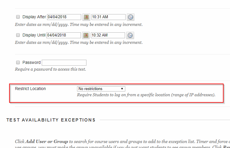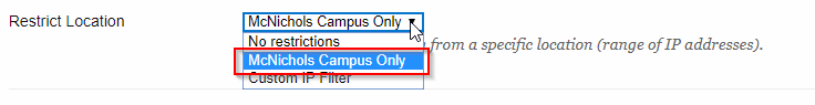 You can easily restrict test takers to the McNichol's Campus using the feature built into the Blackboard Test Options.