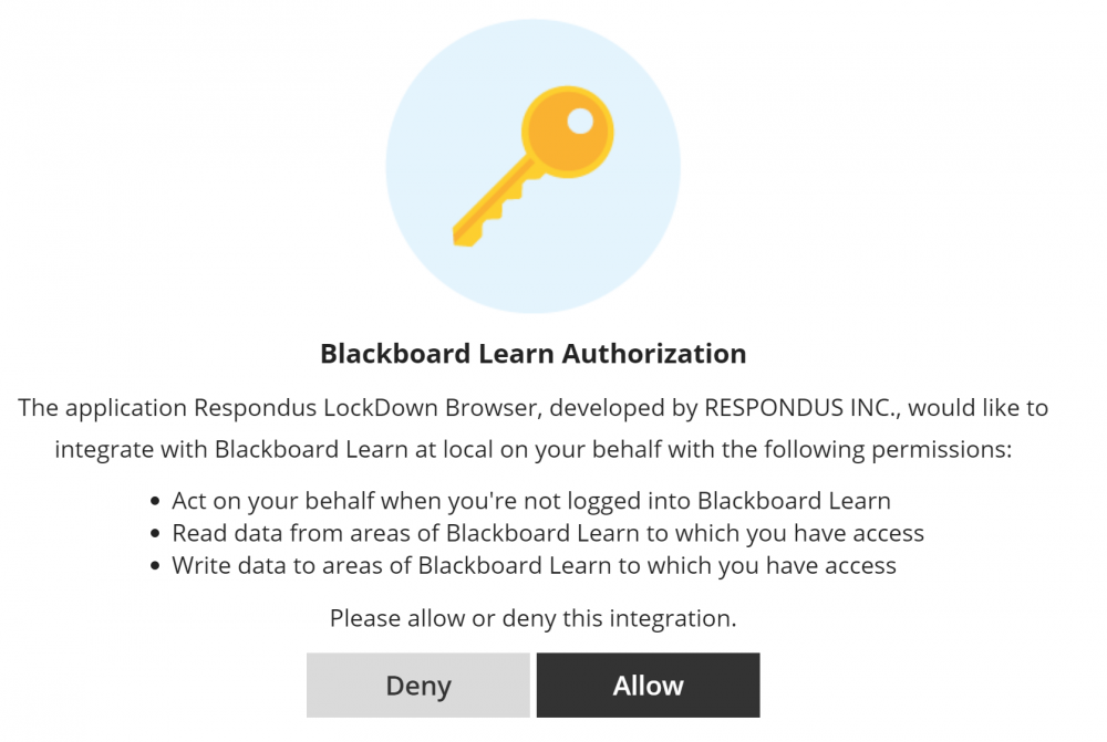 To enable Lockdown Browser and/or Lockdown Monitor, click LOCKDOWN BROWSER DASHBOARD. The first time you do so you will see a prompt requesting permission to access your Blackboard account. You must click ALLOW to use Lockdown Browser Dashboard.