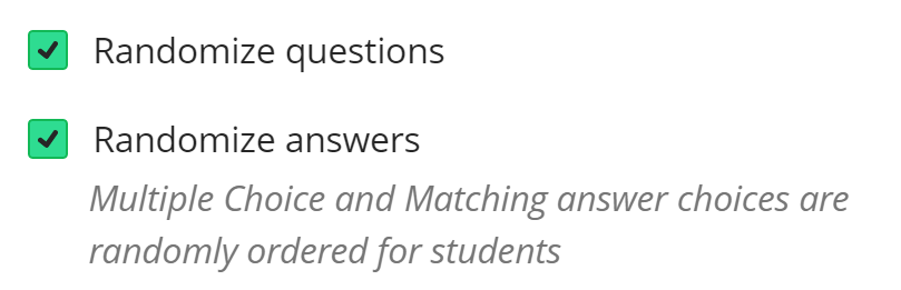 Check the appropriate box to enable question randomization or answer randomization. If these options are enabled, each student will see the questions in a different order, and/or see the answers presented in random order. If you choose to randomize your answers be sure not to reference A/B/C/D in your answer text since these will be randomly assigned. Instead of the fourth answer being "B & C", write out the two answer options again in full, e.g. "Blue and Red"