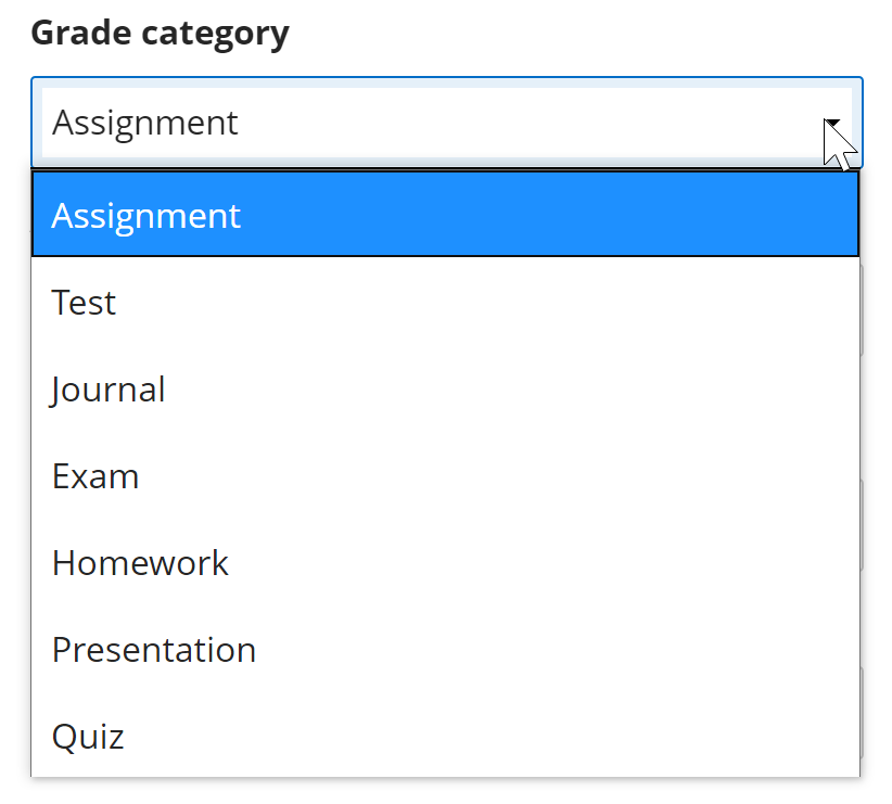 To select a Category for an Assessment, select the option from the Grade Category dropdown menu. The category also controls how the page displays. e.g. a Quiz category Assessment will display “Quiz Settings” at the top of the page, while a Journal category Assessment will display “Journal Settings.” Categories are used to average items together for calculating the Overall Grade in the Gradebook, similar to how they were used in the Weighted Total column in Blackboard Classic.