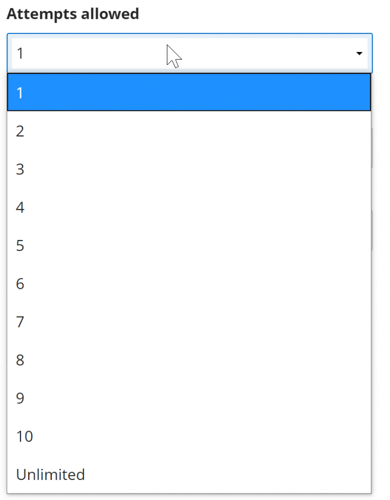 If you want students to have more than one attempt at the assessment, select an option from the Attempts Allowed dropdown menu.
