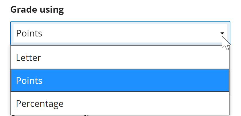 Replacing the “display as” option in Blackboard Classic, the GRADE USING dropdown menu lets you choose whether the results are shown to students as a Letter (based on Gradebook Schemas) raw Points, or a Percentage.