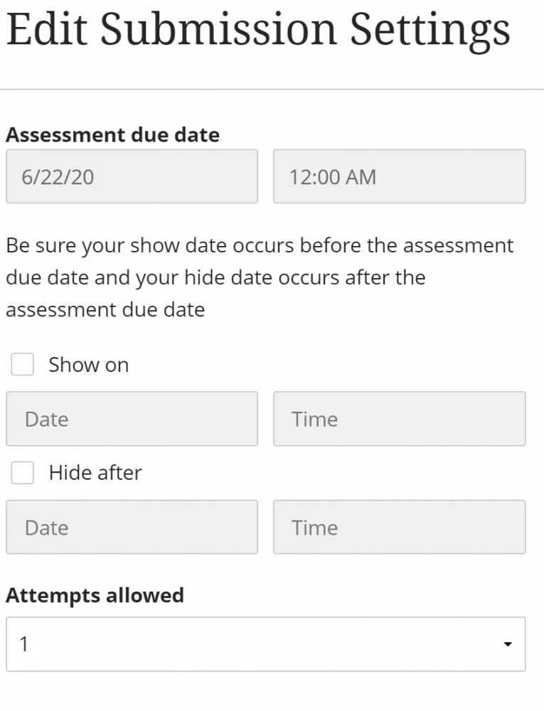 You will be taken to the Submission Settings page where you can override Conditional Availability (the show-on date/time and hide-after date/time) or the number of allowed attempts. These settings will apply only to the one student for the one Assessment.