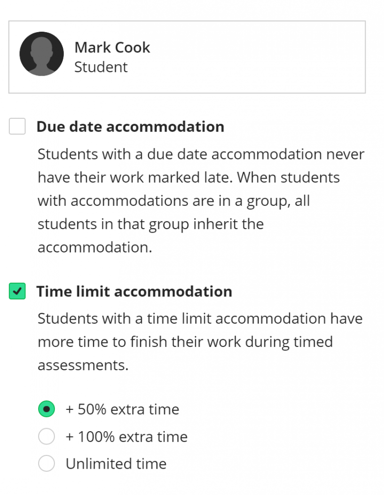 This page covers the Blackboard Ultra replacements for the Availability Exceptions section of Test Options. Exceptions allow you to allow extra Attempts or change the Availability of a single Assessment. Accommodations allow you to extend all timers to 150% or 200% or override due dates for all Assessments, for a single student.