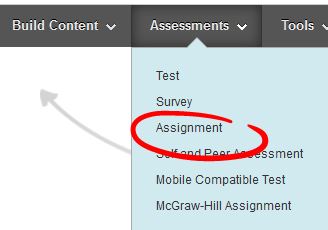 In this tutorial, we will walk through the process of creating an assignment in your Blackboard course. To start, first go into a content area where you wish to make an assignment available to your students. Mouse over the “Assessments” button toward the top of the body of the page and select “Assignment”.