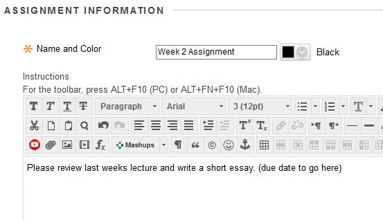 Next, type in the assignment name along with any instructions you may have for your students. Adding a due date into the set of instructions is encouraged, as it can help eliminate any confusion as to when an assignment is due.