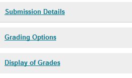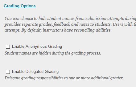 Under Grading Options, you can turn on anonymous grading if you wish. This hides identifying information from the grading process. The "Enable Delegated Grading" option lets you assign grading responsiblities in courses with multiple faculty or teaching assistants.