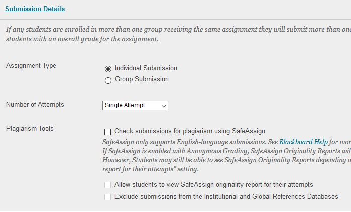The Plagiarism Tool (called SafeAssign) compares student work to a variety of sources, including internet sources, a database of journal articles and books, and an institutional database of previous student submissions, then provides you with an "originality report" indicating potential matches to other sources. This originality report can be for the students to view or the instructor only. Select "Exclude submissions from the Institutional and Global References Database" if the students are submitting a draft assignment (lest their final submission be returned as entirely plagiarized from their own original submission).
