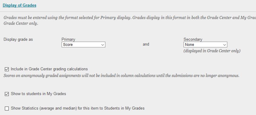 Under Display of Grades, you can change the primary and secondary score (this can also be done in the Grade Center) from the default. NOTE: The secondary display is visible only to faculty in the grade center, it is not visible to students. You may also decide this assignment is a practice, in which case you may wish to uncheck the “Include in grade center grading calculations” option, thus excluding it from the default "Total" column. Generally speaking, it’s a good idea to leave it checked as the default. You may also make the score unavailable to your students by unchecking the “show to students in my grades”. If you wish to show the statistics for the assignment to your students, check the third option.