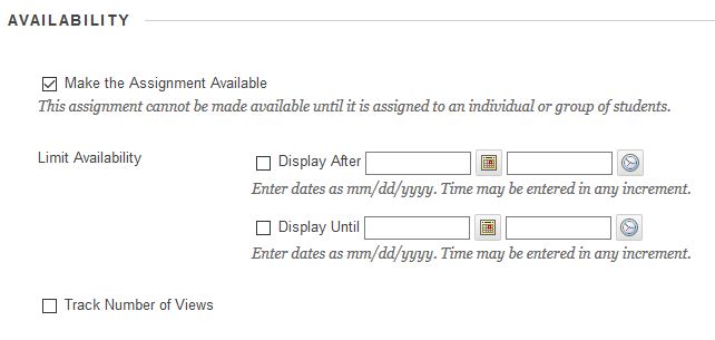 You may wish to limit when your students have access to the assignment. Maybe you are setting up your class for future weeks, or wish to grant them access to the submission space only during a specific time frame. To limit access, first check the appropriate "Display After" / "Display Until" boxes, then enter a date and time range manually or click on the calendar and/or clock icon to set the date and time. If you leave these fields blank, the assignment will be open until you turn it off manually. You may also track the number of views for this assignment by checking the track number of views option.