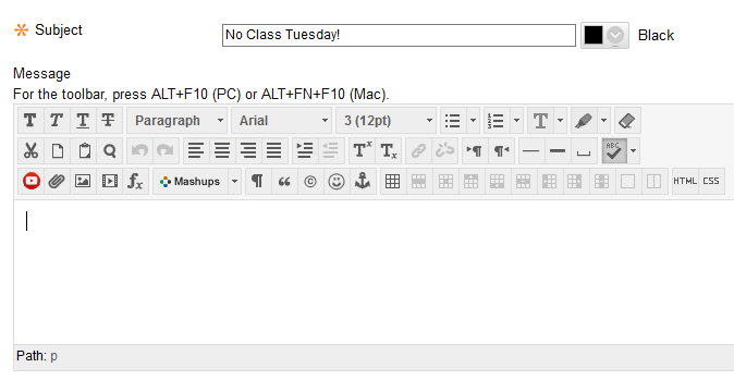 Click in the Subject box to enter the Subject for your announcement. To grab the attention of students, the subject of your announcement can be entered in colorful text using the color select menu located next to the Subject line.