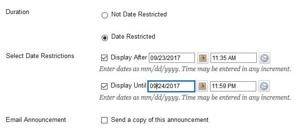 Set the Duration and Date Restrictions by clicking the button and boxes next to each field as shown here. You can enter a date directly, or use the calendar and/or clock icons to select a specific date and time. If your announcement topic is important and students will benefit from seeing it each each time they enter the course site, choose “Not Date Restricted” to keep it displayed throughout the semester. If the subject of your announcement is timely, you may not need to keep it more than a week or so.