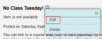 - Click Edit (or “delete”) from the options menu next to the title of the Announcement to be edited.